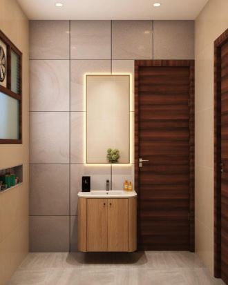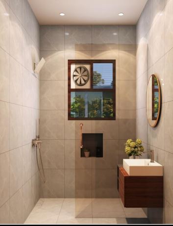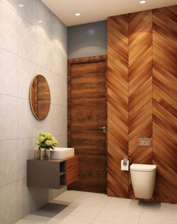 Color scheme of master bedroom toilet is light with wood textured walls within. Light color tiles are used so that it makes the space look more spacious and comfy.