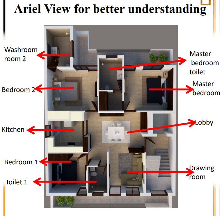 This layout plan consists of 3 bedrooms, 2 bedroom attached with bathroom and one attached with common washroom, living room, dining room attached with kitchen.